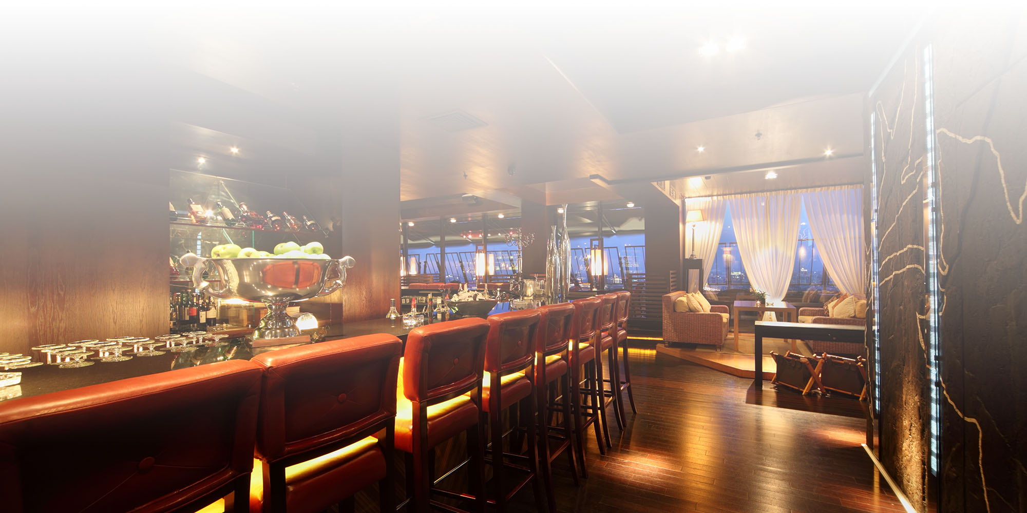 Image: bar counter with chairs in empty comfortable restaurant at night